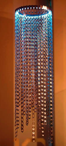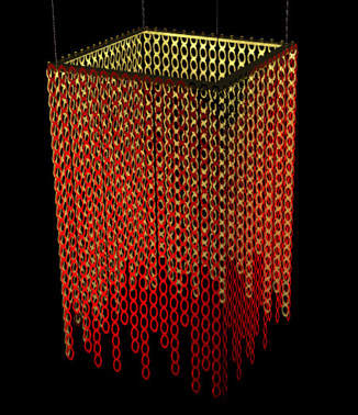 The swing of the chandelier style earring was the inspiration for the Glolink light fitting.Based on a single link unit of pressed aluminium, the Glolink can be adapted, customised in colour, finish and size to meet the need for medium to large scale lighting fixtures. Links are curved for greater strength and ease of assembly. The resultant luxuriant texture also relates back to the jewellery and creates more interesting shadowing effects